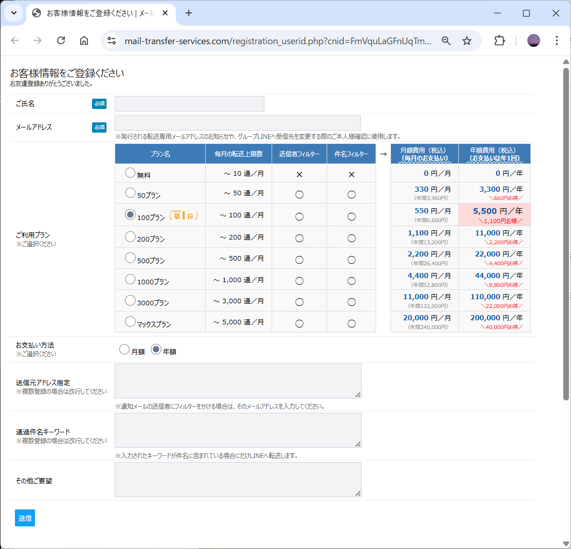 | ・お名前 ・メールアドレス(ご連絡用) ・料金プラン選択 ・その他ご要望