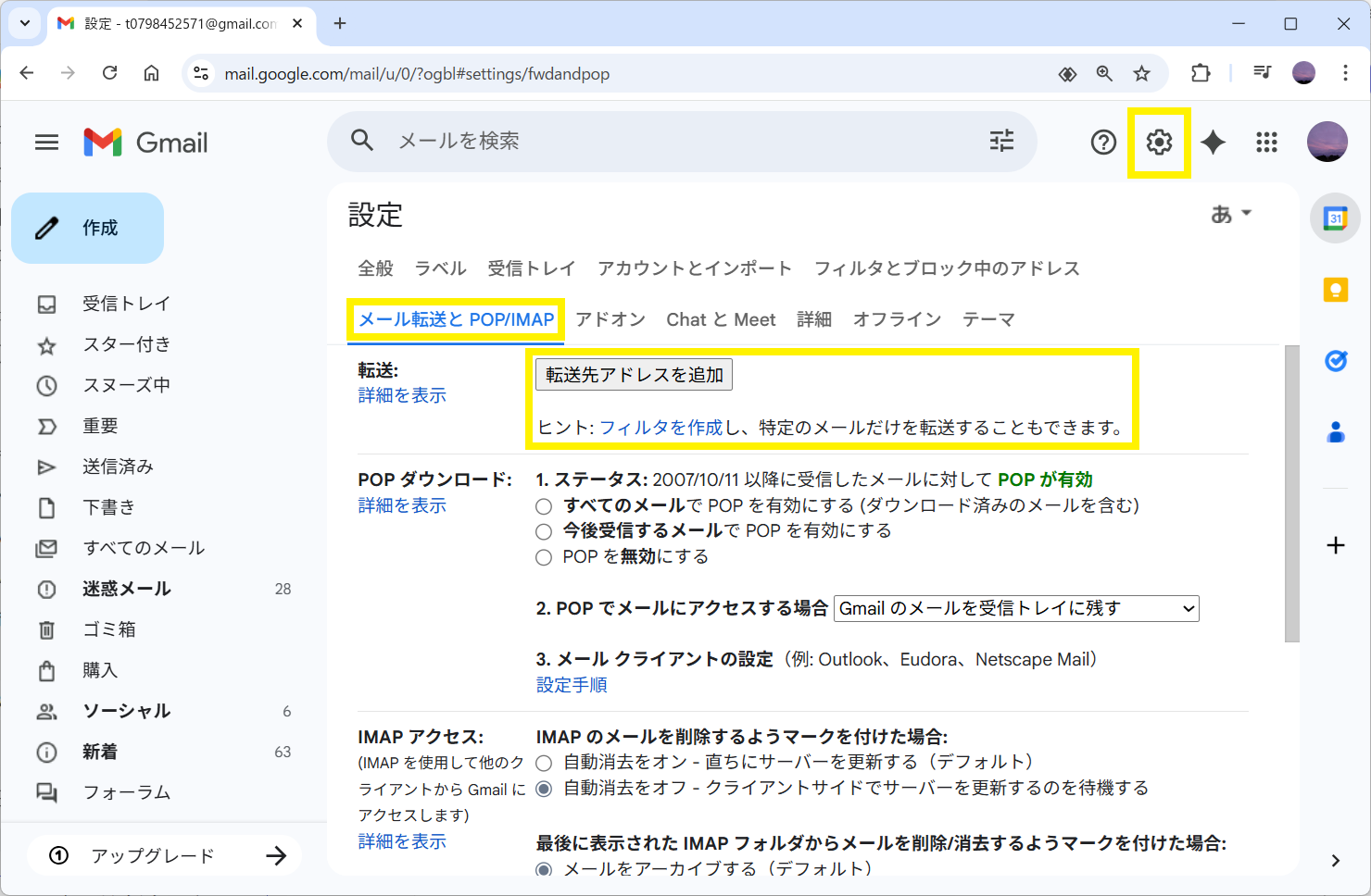 | Gmailの転送設定画面 |